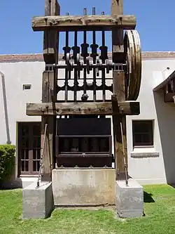 L'outil fait l'objet d'une description dans l'encyclopédie Diderot[1]. L'outil est constitué d'un ensemble de pilons entraînés par des cames. Chaque pilon est composé d’une tige verticale en bois ou en métal muni dans sa partie inférieure d’une masse pesante. Cette masse, le sabot, frappe les éléments à réduire, en tombant dans un bassin ou auge. Des glissières verticales en assurent une montée et descente régulières. Un arbre horizontal entraîné par une roue, porte sur sa circonférence un nombre de cames multiple du nombre de pilons. Chaque came, rencontrant sur l’un des côtés de la tige verticale une saillie (appelée ergot ou mentonnet), soulève le pilon avant de le relâcher.