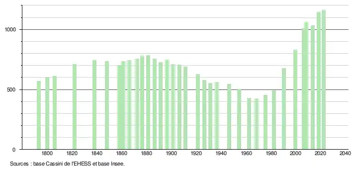 L'évolution du nombre d'habitants est connue à travers les recensements de la population effectués dans la commune depuis 1793. Pour les communes de moins de 10 000 habitants, une enquête de recensement portant sur toute la population est réalisée tous les cinq ans, les populations de référence des années intermédiaires étant quant à elles estimées par interpolation ou extrapolation[21]. Pour la commune, le premier recensement exhaustif entrant dans le cadre du nouveau dispositif a été réalisé en 2008[22].