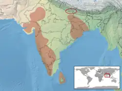 Cette espèce se rencontre en Inde (Andhra Pradesh, Bengale-Occidental, Bihar, Gujarat, Kerala, Madhya Pradesh, Maharashtra, Orissa, sud du Rajasthan, Sikkim, Tamil Nadu, Uttar Pradesh et Uttarakhand), au Népal et au Sri Lanka[1].