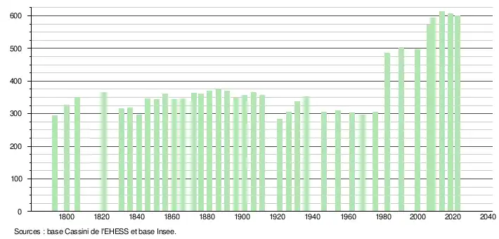 L'évolution du nombre d'habitants est connue à travers les recensements de la population effectués dans la commune depuis 1793. Pour les communes de moins de 10 000 habitants, une enquête de recensement portant sur toute la population est réalisée tous les cinq ans, les populations de référence des années intermédiaires étant quant à elles estimées par interpolation ou extrapolation[21]. Pour la commune, le premier recensement exhaustif entrant dans le cadre du nouveau dispositif a été réalisé en 2008[22].