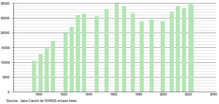 - ↑ Par convention dans Wikipédia, le principe a été retenu de n’afficher dans le tableau des recensements et le graphique, pour les populations de référence postérieures à 1999, que les populations correspondant à une enquête exhaustive de recensement pour les communes de moins de 10 000 habitants, et que les populations des années 2006, 2011, 2016, etc. pour les communes de plus de 10 000 habitants, ainsi que la dernière population de référence publiée par l’Insee pour l'ensemble des communes.
