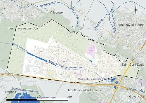La commune est traversée par la Rigole des Clayes, un ouvrage hydrolique creusé par Lambert, Billet et Guignard en 1678-1679 pour alimenter le système hydraulique du château de Versailles et qui prend sa source dans la forêt, sur le territoire des Clayes-sous-Bois.