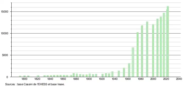 6. Par convention dans Wikipédia, le principe a été retenu de n’afficher dans le tableau des recensements et le graphique, pour les populations de référence postérieures à 1999, que les populations correspondant à une enquête exhaustive de recensement pour les communes de moins de 10 000 habitants, et que les populations des années 2006, 2011, 2016, etc. pour les communes de plus de 10 000 habitants, ainsi que la dernière population de référence publiée par l’Insee pour l'ensemble des communes.