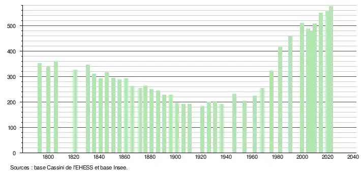 L'évolution du nombre d'habitants est connue à travers les recensements de la population effectués dans la commune depuis 1793. Pour les communes de moins de 10 000 habitants, une enquête de recensement portant sur toute la population est réalisée tous les cinq ans, les populations de référence des années intermédiaires étant quant à elles estimées par interpolation ou extrapolation[21]. Pour la commune, le premier recensement exhaustif entrant dans le cadre du nouveau dispositif a été réalisé en 2004[22].