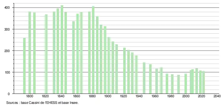L'évolution du nombre d'habitants est connue à travers les recensements de la population effectués dans la commune depuis 1793. Pour les communes de moins de 10 000 habitants, une enquête de recensement portant sur toute la population est réalisée tous les cinq ans, les populations de référence des années intermédiaires étant quant à elles estimées par interpolation ou extrapolation[22]. Pour la commune, le premier recensement exhaustif entrant dans le cadre du nouveau dispositif a été réalisé en 2008[23].