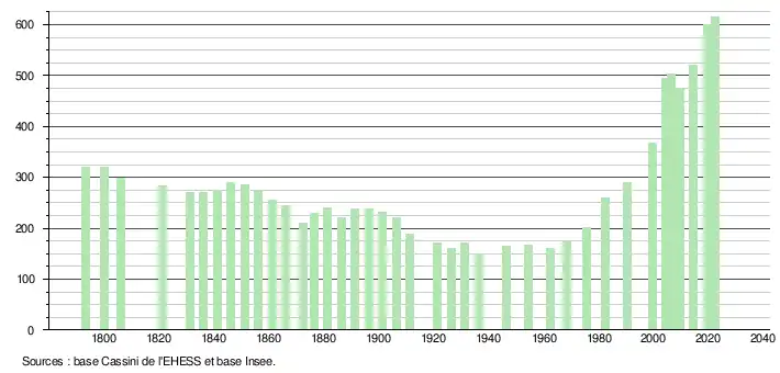 L'évolution du nombre d'habitants est connue à travers les recensements de la population effectués dans la commune depuis 1793. Pour les communes de moins de 10 000 habitants, une enquête de recensement portant sur toute la population est réalisée tous les cinq ans, les populations de référence des années intermédiaires étant quant à elles estimées par interpolation ou extrapolation[18]. Pour la commune, le premier recensement exhaustif entrant dans le cadre du nouveau dispositif a été réalisé en 2004[19].