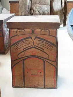 Les boîtes en bois courbé sont un produit traditionnel fabriqué par les peuples des Premières nations de la côte ouest nord-américaine, notamment les Haïdas , les Gitxsan , les Tlingits , les Tsimshians , les Sugpiaq , les Unangax , les Yup'ik , les Inupiaq et les Salish du littoral. Ces boîtes sont généralement fabriquées à partir d’un seul morceau de bois étuvés à la vapeur et plié pour former boîte. Les utilisations traditionnelles des boîtes étaient variées et comprenaient le stockage de produits alimentaires, de vêtements et d'inhumation. Elles étaient souvent dépourvues de décoration alors que d'autres étaient décorées avec minutie. Aujourd'hui, beaucoup sont faites pour les collectionneurs et peuvent être achetées dans des musées, des boutiques de cadeaux et des sites en ligne, ainsi que directement sur commande par des artistes[2],[3],[4],[5].