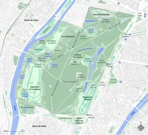 La partie centrale du bois accueille le parc de Bagatelle, ainsi que le jardin du Pré-Catelan. Sa partie nord est occupée par le Jardin d'acclimatation, un parc d'attractions jadis célèbre pour sa ménagerie et aujourd'hui pour abriter la fondation Louis-Vuitton. Au sud-est se situe le jardin des serres d'Auteuil et l'hippodrome d'Auteuil. Au sud-ouest, entre l'hippodrome de Longchamp et le parc de Bagatelle, se trouvent le golf de Longchamp ainsi que les château et domaine de Longchamp, qui abritent depuis 2015 la fondation GoodPlanet.