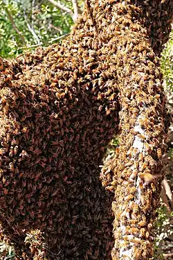 Un arbre tombé sert ici de support à un essaim d'abeilles. L'arbre creux est dans la nature l'habitat le plus naturellement choisi par les abeilles sauvages.