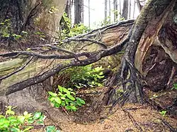 « Tronc-nurserie » (Nurse log pour les anglophones) ; ils sont caractéristiques des forêts anciennes ou à haute naturalité. Ces troncs (couchés ou debout) morts souvent couvert d'une couche de mousse peuvent se gorger d'eau (ou être significativement humide, même en période sèche grâce à des substances mucilagineuses). Ils offrent un terrain de départ aux semis naturels. (ici de Tsuga heterophylla). L'humidité conservée par ces troncs est aussi appréciée voire nécessaire pour diverses espèces d'invertébrés (limaces, escargots, insectes, etc.) notamment consommées par des salamandres sans poumons (très sensibles à la dessiccation).