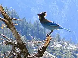 De nombreux oiseaux territoriaux ou chasseurs apprécient les perchoirs à vue dégagée qu’offre le bois mort, comme ici ce geai de Steller.