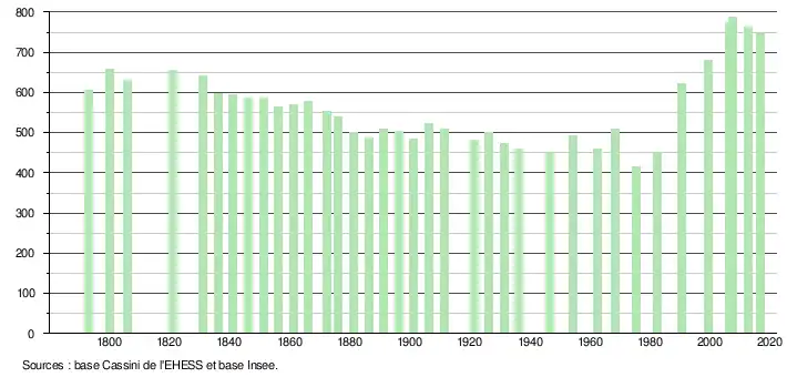 L'évolution du nombre d'habitants est connue à travers les recensements de la population effectués dans la commune depuis 1793. Pour les communes de moins de 10 000 habitants, une enquête de recensement portant sur toute la population est réalisée tous les cinq ans, les populations de référence des années intermédiaires étant quant à elles estimées par interpolation ou extrapolation[7]. Pour la commune, le premier recensement exhaustif entrant dans le cadre du nouveau dispositif a été réalisé en 2007[8].