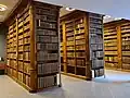 Les rayonnages sont toujours en épi et tous perpendiculaires au même mur, laissant une allée latérale pour traverser la pièce.