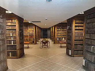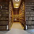 Les rayonnages perpendiculaires aux murs formaient une grande allée centrale et desservaient sur les côtés des cabinets de lecture. Ceux-ci permettaient aux moines d'étudier. En effet, les collections de la bibliothèque étaient rangées de manière thématique de sorte qu'un moine étudiant puisse facilement disposer de tous les ouvrages traitant du thème étudié[2]. Ce système de rayonnage et d'organisation semble au rare au xviiie siècle ; le rayonnage en épi apparaît au xixe siècle[4].