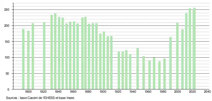 L'évolution du nombre d'habitants est connue à travers les recensements de la population effectués dans la commune depuis 1793. Pour les communes de moins de 10 000 habitants, une enquête de recensement portant sur toute la population est réalisée tous les cinq ans, les populations de référence des années intermédiaires étant quant à elles estimées par interpolation ou extrapolation[29]. Pour la commune, le premier recensement exhaustif entrant dans le cadre du nouveau dispositif a été réalisé en 2006[30].