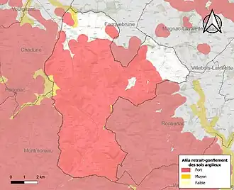 Le retrait-gonflement des sols argileux est susceptible d'engendrer des dommages importants aux bâtiments en cas d’alternance de périodes de sécheresse et de pluie. 81,6 % de la superficie communale est en aléa moyen ou fort (67,4 % au niveau départemental et 48,5 % au niveau national). Sur les 375 bâtiments dénombrés sur la commune en 2019, 316 sont en aléa moyen ou fort, soit 84 %, à comparer aux 81 % au niveau départemental et 54 % au niveau national. Une cartographie de l'exposition du territoire national au retrait gonflement des sols argileux est disponible sur le site du BRGM[14],[15].