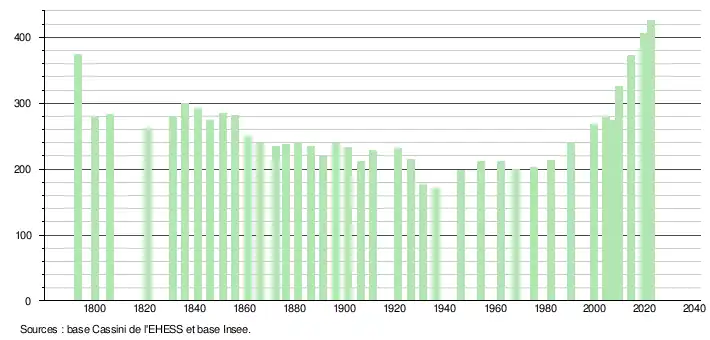 L'évolution du nombre d'habitants est connue à travers les recensements de la population effectués dans la commune depuis 1793. Pour les communes de moins de 10 000 habitants, une enquête de recensement portant sur toute la population est réalisée tous les cinq ans, les populations de référence des années intermédiaires étant quant à elles estimées par interpolation ou extrapolation[19]. Pour la commune, le premier recensement exhaustif entrant dans le cadre du nouveau dispositif a été réalisé en 2004[20].