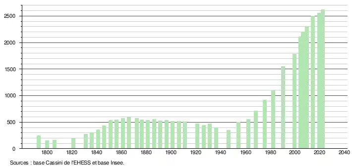 L'évolution du nombre d'habitants est connue à travers les recensements de la population effectués dans la commune depuis 1793. Pour les communes de moins de 10 000 habitants, une enquête de recensement portant sur toute la population est réalisée tous les cinq ans, les populations de référence des années intermédiaires étant quant à elles estimées par interpolation ou extrapolation[26]. Pour la commune, le premier recensement exhaustif entrant dans le cadre du nouveau dispositif a été réalisé en 2004[27].