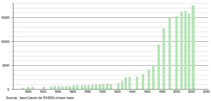 L'évolution du nombre d'habitants est connue à travers les recensements de la population effectués dans la commune depuis 1793. Pour les communes de plus de 10 000 habitants les recensements ont lieu chaque année à la suite d'une enquête par sondage auprès d'un échantillon d'adresses représentant 8 % de leurs logements, contrairement aux autres communes qui ont un recensement réel tous les cinq ans[19],[Note 4].