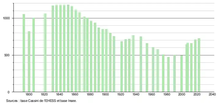 L'évolution du nombre d'habitants est connue à travers les recensements de la population effectués dans la commune depuis 1793. Pour les communes de moins de 10 000 habitants, une enquête de recensement portant sur toute la population est réalisée tous les cinq ans, les populations de référence des années intermédiaires étant quant à elles estimées par interpolation ou extrapolation[26]. Pour la commune, le premier recensement exhaustif entrant dans le cadre du nouveau dispositif a été réalisé en 2007[27].
