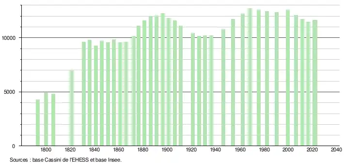 - ↑ Par convention dans Wikipédia, le principe a été retenu de n’afficher dans le tableau des recensements et le graphique, pour les populations de référence postérieures à 1999, que les populations correspondant à une enquête exhaustive de recensement pour les communes de moins de 10 000 habitants, et que les populations des années 2006, 2011, 2016, etc. pour les communes de plus de 10 000 habitants, ainsi que la dernière population de référence publiée par l’Insee pour l'ensemble des communes.