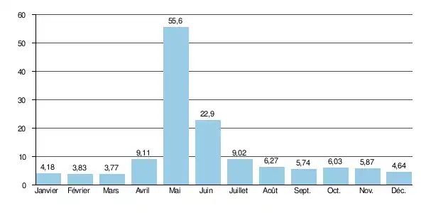 En ce qui concerne la période libre de glaces (de mai à octobre inclus), le débit minimal observé a été de 3,16 m3/s en , ce qui restait fort acceptable comparé au débit moyen.