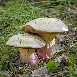 • Le Bolet à beau pied (Caloboletus calopus), au chapeau blanchâtre à brunâtre, aux pores jaunes et au pied jaune et rouge orné d'une réseau. Amer, non comestible, potentiellement émétique.