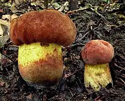 Forme rubicundus.Suillellus queletii var. rubicundus, variété rubiconde. Chapeau rouge pourpre, rougeâtre. Pores orangeâtre sale. Stipe plus ou moins ponctué de rouge pourpre, rougeâtre. Base betterave, couche jaune sous les tubes. Sous chênes divers, assez fréquent sous chênes verts[10]. Suillellus queletii var. aurantiacus semble identique.