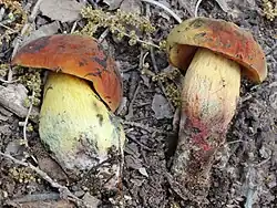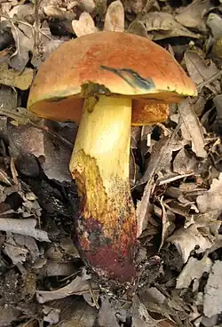 Le Bolet de Dupain (Rubroboletus dupainii), au chapeau rouge laqué, aux pores rouges et au pied jaune crème lavé de rougeâtre, sans base betterave. Sans interêt alimentaire cuit, toxique cru.
