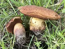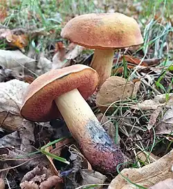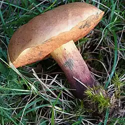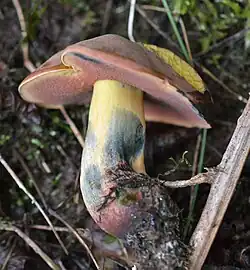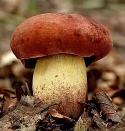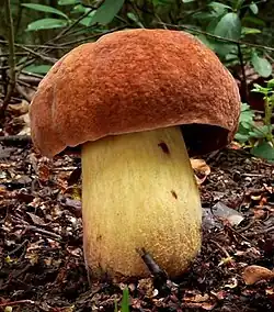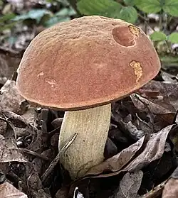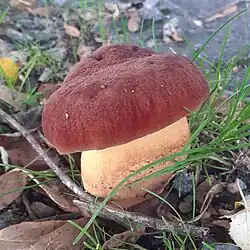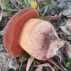 Le Bolet odorant (Lanmaoa fragrans), au chapeau marron, aux pores bruns, au pied radicant sans base betterave et à l'odeur fruitée. Comestible.