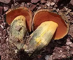 La chair est jaune à jaune pâle, bleuissante à la coupe, de couleur rouge pourpre betterave à la base. Elle peut occasionnellement être rougeâtre sous le chapeau, présentant ainsi une ligne de Bataille au dessus des tubes, comme chez S. luridus. Sa saveur est douce et son odeur est faible[8],[9].