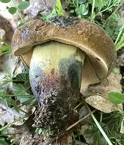 Suillellus queletii var. squarrosipes, variété squamuleuse. Chapeau cannelle jaunâtre, pores jaune d'or, tubes légèrement déprimés autour du pied. Base du stipe à peine rougeâtre, à la surface diffractée en carrés sur sa moitié inférieure, formant des squamules[11].