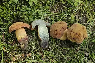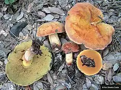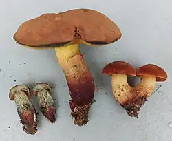 Suillellus queletii var. pseudoluridus, variété semblable à S. luridus. Chapeau irrégulier orangeâtre d'aspect granité. Pores orangeâtres. Stipe ponctué de fines méchules rouges avec parfois un début de pseudo-réseau. Chair jaune, rouge betterave dans sa moitié inférieure, plus noirâtre à la coupe que chez S. queletii. Ligne de Bataille plus au moins bien définie[10].