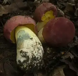 Le Bolet joli (Rubroboletus pulchrotinctus), bleuit également souvent uniquement au niveau du chapeau à la coupe, chapeau rosé feutré de blanc pur, présente souvent des teintes orangées un peu rougeâtres sur ses pores et son stipe. Toxique.