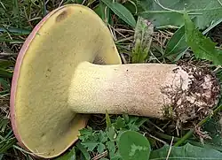 Le Bolet appendiculé (Butyriboletus appendiculatus), chapeau brunâtre moins rose ou bien sans rose, chair non ou très peu bleuissante, sans cerne rose autour du stipe. Comestible réputé.