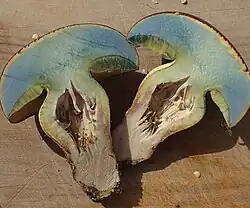 Le Bolet faux-radicant (Caloboletus kluzakii), très rare, chapeau blanchâtre légèrement rosé, chair entièrement bleuissante à la coupe, chair amère. Amer, non comestible, potentiellement émétique.