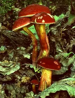 Le Bolet rubicond (Xerocomellus redeuilhii), à la moitié inférieure du pied rouge betterave à sa surface et dans sa chair non bleuissante. Sans intérêt alimentaire.