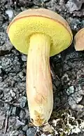Le Bolet à base jaune (Xerocomus chrysonemus): Espèce rare. Tubes et pores jaune d'or. Chapeau généralement plus clair. Chair blanchâtre, jaune vif au bout du pied, parfois avec un peu de bleuissement à cet endroit, pied très radicant. Mycélium jaune vif. Sans intérêt alimentaire.