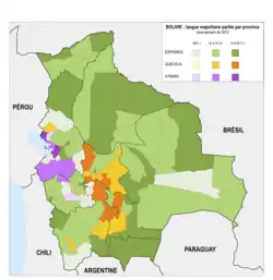 | Langues officielles | Quechua, guarani, aymara et espagnol (de jure, national) ainsi que 36 langues indigènes (de jure, régional)[1] |