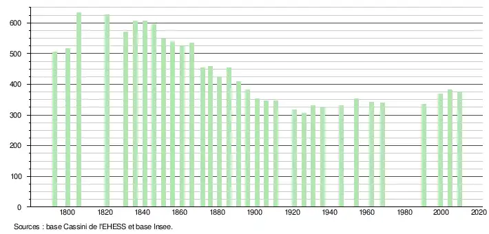 - ↑ Par convention dans Wikipédia, le principe a été retenu de n’afficher dans le tableau des recensements et le graphique, pour les populations légales postérieures à 1999, que les populations correspondant à une enquête exhaustive de recensement pour les communes de moins de 10 000 habitants, et que les populations des années 2006, 2011, 2016, etc. pour les communes de plus de 10 000 habitants, ainsi que la dernière population légale publiée par l’Insee pour l'ensemble des communes.