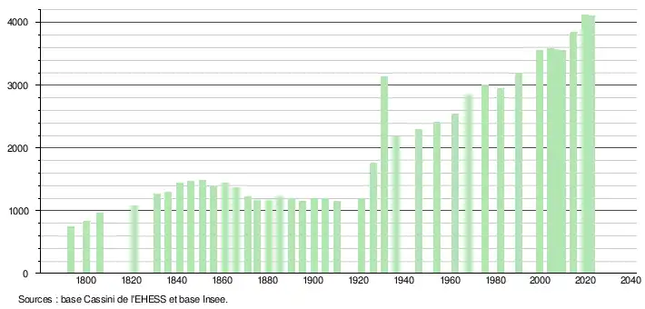 L'évolution du nombre d'habitants est connue à travers les recensements de la population effectués dans la commune depuis 1793. Pour les communes de moins de 10 000 habitants, une enquête de recensement portant sur toute la population est réalisée tous les cinq ans, les populations de référence des années intermédiaires étant quant à elles estimées par interpolation ou extrapolation[30]. Pour la commune, le premier recensement exhaustif entrant dans le cadre du nouveau dispositif a été réalisé en 2004[31].