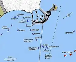 L'amiral est rejoint à Gibraltar par une escadre du royaume des Pays-Bas, qui propose son aide. Les exigences de l'expédition sont la libération sans rançon des esclaves chrétiens, la restitution des rançons payées par les États de Savoie et le royaume de Naples pour le rachat de leurs sujets, l'abolition de l'esclavage et la paix avec les Pays-Bas. Devant le refus, la canonnade entre la flotte britanico-néerlandaise et l'artillerie côtière commence[4].