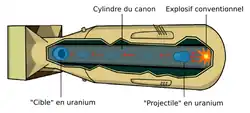 La bombe larguée sur Hiroshima, Little Boy, utilisait cette technique. Le fait que cette technique ait été employée sans essai préalable (contrairement au type à implosion utilisé sur Nagasaki) montre à quel point ce mode de fonctionnement est fiable, et relativement facile à maîtriser.