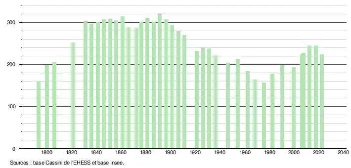 L'évolution du nombre d'habitants est connue à travers les recensements de la population effectués dans la commune depuis 1793. Pour les communes de moins de 10 000 habitants, une enquête de recensement portant sur toute la population est réalisée tous les cinq ans, les populations de référence des années intermédiaires étant quant à elles estimées par interpolation ou extrapolation[21]. Pour la commune, le premier recensement exhaustif entrant dans le cadre du nouveau dispositif a été réalisé en 2007[22].