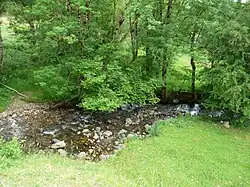 Le Bonjon à Condat, à moins de 200 mètres de sa confluence avec la Rhue. | |