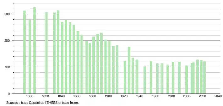 L'évolution du nombre d'habitants est connue à travers les recensements de la population effectués dans la commune depuis 1793. Pour les communes de moins de 10 000 habitants, une enquête de recensement portant sur toute la population est réalisée tous les cinq ans, les populations de référence des années intermédiaires étant quant à elles estimées par interpolation ou extrapolation[29]. Pour la commune, le premier recensement exhaustif entrant dans le cadre du nouveau dispositif a été réalisé en 2008[30].