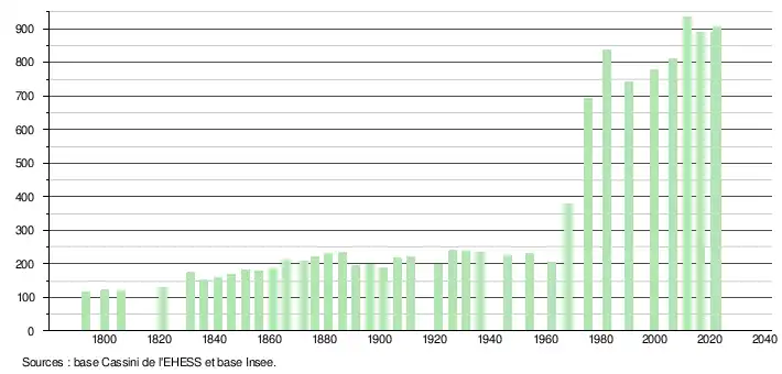 L'évolution du nombre d'habitants est connue à travers les recensements de la population effectués dans la commune depuis 1793. Pour les communes de moins de 10 000 habitants, une enquête de recensement portant sur toute la population est réalisée tous les cinq ans, les populations de référence des années intermédiaires étant quant à elles estimées par interpolation ou extrapolation[16]. Pour la commune, le premier recensement exhaustif entrant dans le cadre du nouveau dispositif a été réalisé en 2006[17].