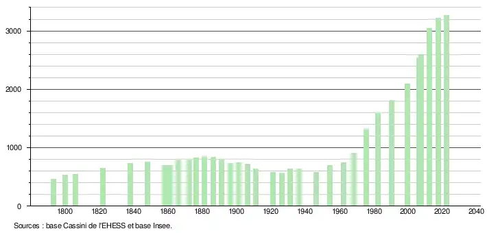 L'évolution du nombre d'habitants est connue à travers les recensements de la population effectués dans la commune depuis 1793. Pour les communes de moins de 10 000 habitants, une enquête de recensement portant sur toute la population est réalisée tous les cinq ans, les populations de référence des années intermédiaires étant quant à elles estimées par interpolation ou extrapolation[13]. Pour la commune, le premier recensement exhaustif entrant dans le cadre du nouveau dispositif a été réalisé en 2007[14].