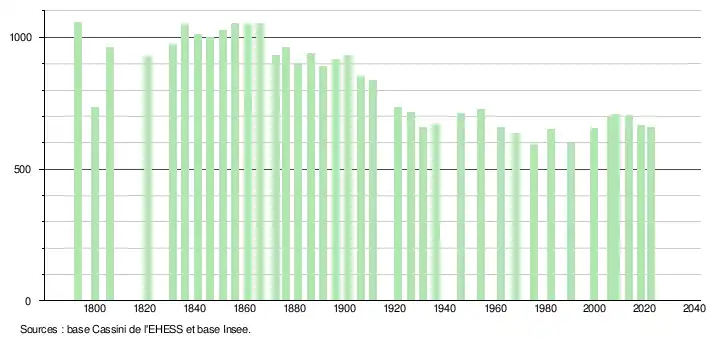 L'évolution du nombre d'habitants est connue à travers les recensements de la population effectués dans la commune depuis 1793. Pour les communes de moins de 10 000 habitants, une enquête de recensement portant sur toute la population est réalisée tous les cinq ans, les populations de référence des années intermédiaires étant quant à elles estimées par interpolation ou extrapolation[27]. Pour la commune, le premier recensement exhaustif entrant dans le cadre du nouveau dispositif a été réalisé en 2008[28].