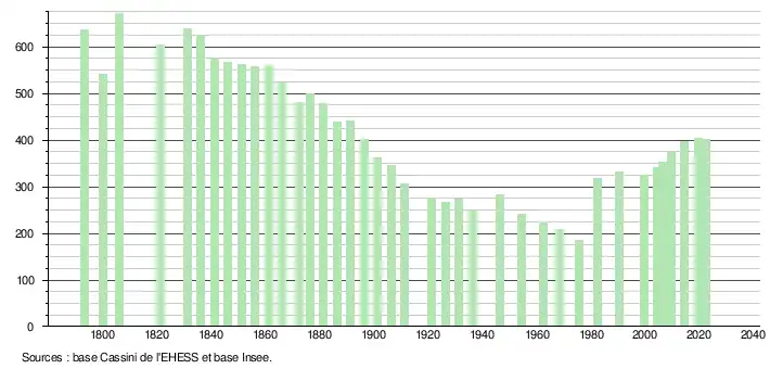 L'évolution du nombre d'habitants est connue à travers les recensements de la population effectués dans la commune depuis 1793. Pour les communes de moins de 10 000 habitants, une enquête de recensement portant sur toute la population est réalisée tous les cinq ans, les populations de référence des années intermédiaires étant quant à elles estimées par interpolation ou extrapolation[27]. Pour la commune, le premier recensement exhaustif entrant dans le cadre du nouveau dispositif a été réalisé en 2004[28].